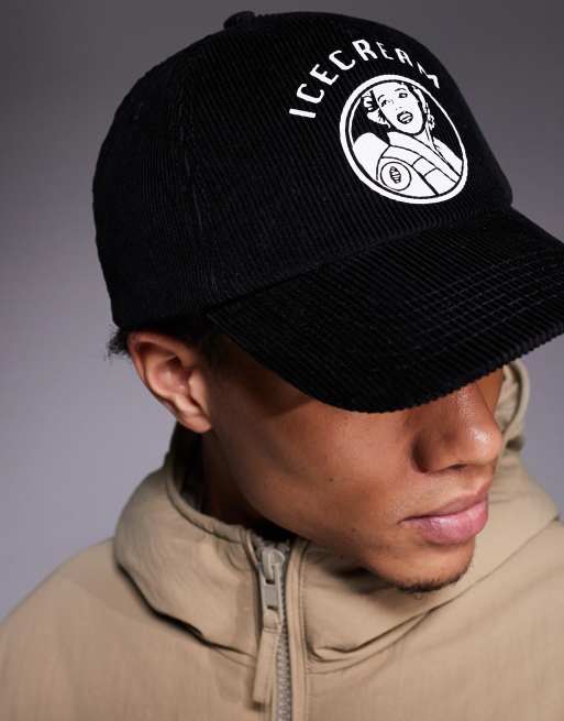 ICECREAM – Czarna sztruksowa czapka z daszkiem trucker i motywem kelnerki