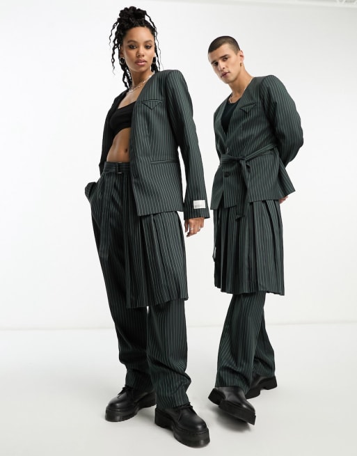IIQUAL – Granatowo-zielony zestaw unisex w prążki: spodnie ze spódnicą i marynarka z paskiem