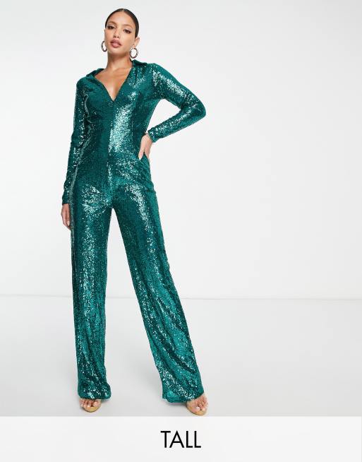 In The Style Tall – Exclusive – Zielony cekinowy kombinezon z głębokim dekoltem i szerokimi nogawkami