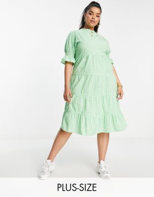 Influence Plus – Zielona sukienka midi w kratkę vichy z krótkimi rękawami i falbankami