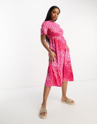 Influence – Czerwona sukienka midi w kwiatowy wzór ze zwiewnymi rękawami