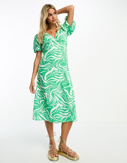 Influence – Zielona sukienka midi z dekoltem w szpic w abstrakcyjny wzór