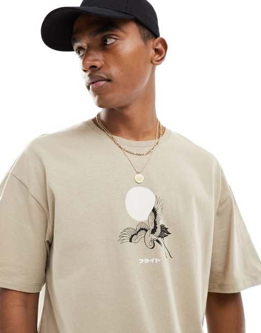 Jack & Jones – Beżowy T-shirt oversize z nadrukiem na piersi