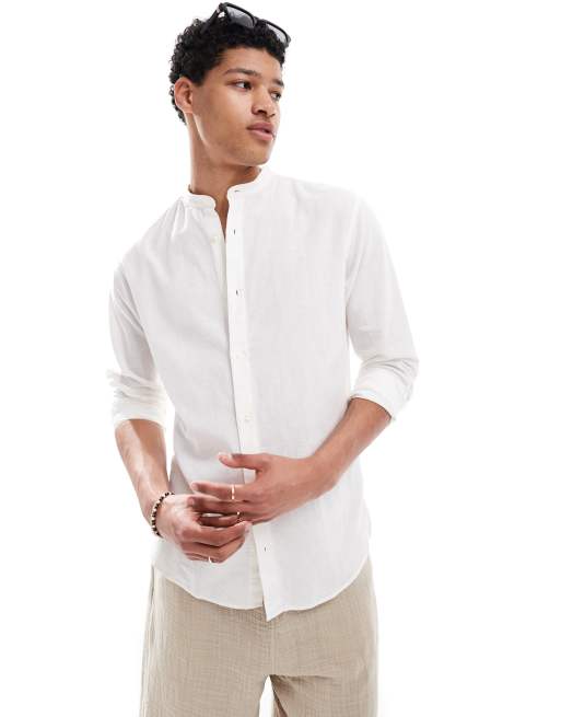 Jack & Jones – Biała, dopasowana koszula ze stójką z materiału z dodatkiem lnu