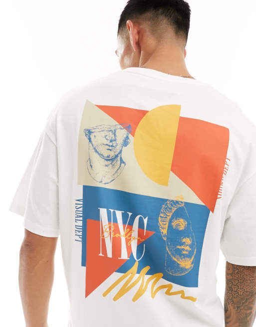 Jack & Jones – Biały T-shirt oversize z blokami kolorów i motywem NYC na plecach