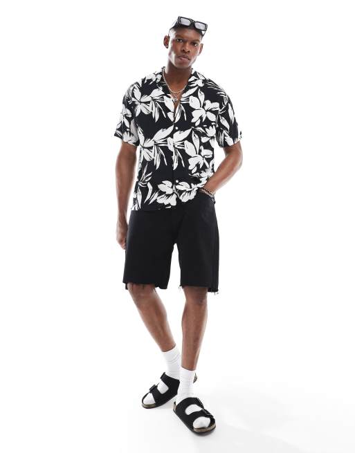 Jack & Jones – Czarna koszula z kołnierzykiem kubańskim w kwiatowy wzór