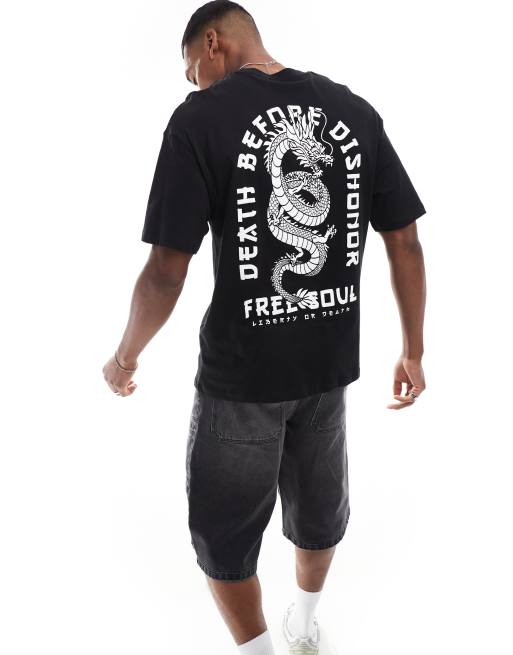Jack & Jones – Czarny T-shirt oversize z japońskim nadrukiem smoka na plecach