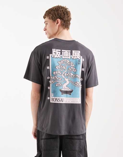Jack & Jones – Grafitowoszary T-shirt z nadrukiem drzewka bonsai na plecach