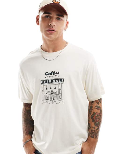 Jack & Jones – Kremowy T-shirt oversize z nadrukiem „Cafe 44” na dekolcie