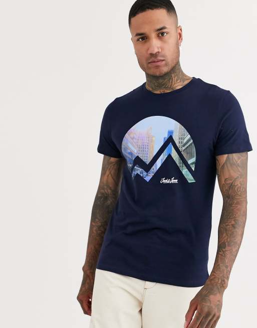 Jack & Jones – Originals – Granatowy T-shirt z grafiką gór