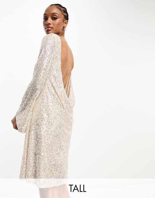 Jaded Rose Tall – Srebrna cekinowa sukienka mini z długimi rękawami i drapowanym tyłem