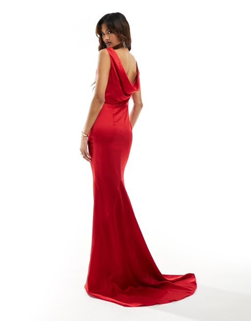 Jarlo – Czerwona satynowa sukienka maxi z drapowanym tyłem i trenem