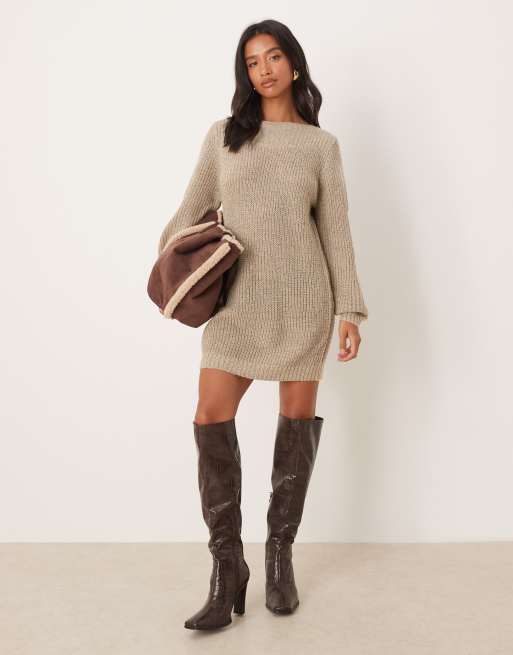 JDY Petite – Beżowa dzianinowa sukienka mini z szerokim dekoltem