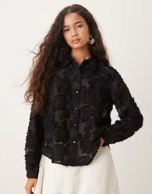 JDY – Czarna prześwitująca koszula w kwiatowy wypukły wzór z rzęskami