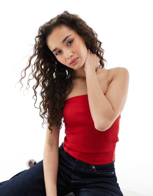JJXX – Czerwony prążkowany top z dekoltem bandeau