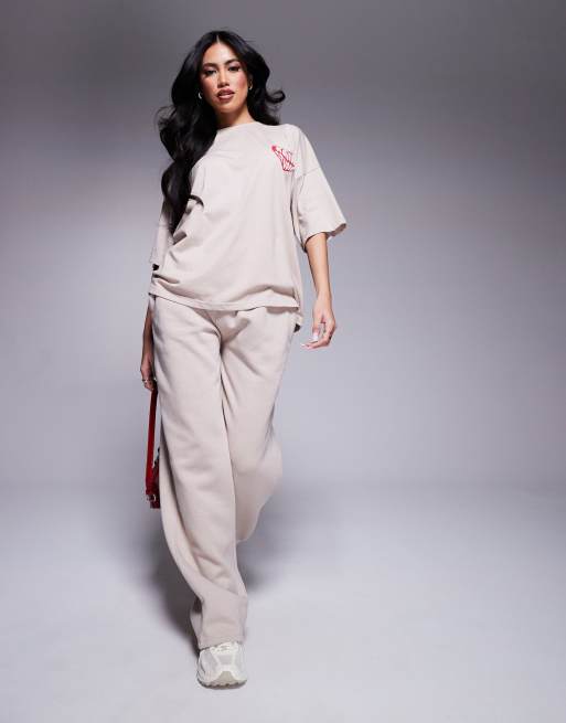 Kaiia – Beżowo-czerwony zestaw: bluza z kapturem oversize, T-shirt i joggersy z logo z sercem