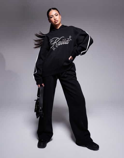 Kaiia – Czarno-biały zestaw: bluza oversize z kapturem i rękawami w paski oraz joggersy z szerokimi nogawkami