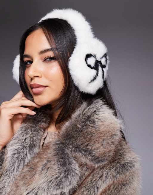 Kaiia Exclusive – Białe nauszniki ze sztucznego futra z nadrukiem w kokardki