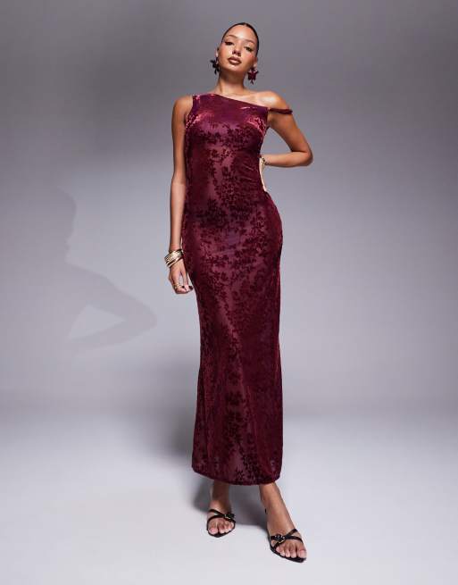 Kaiia Exclusive – Burgundowa sukienka maxi z odsłoniętymi ramionami, skręconym ramiączkiem i wzorem devore