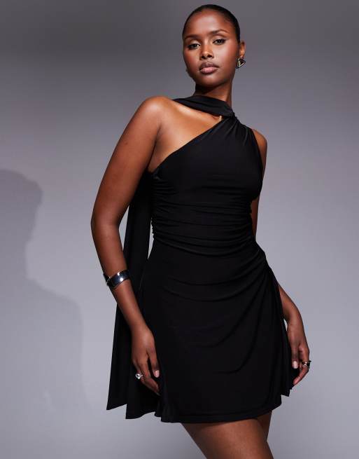 Kaiia Exclusive – Czarna przylegająca dwuwarstwowa sukienka mini skater na jedno ramię z szalem