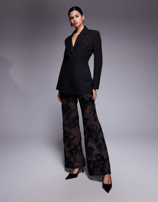 Kaiia Exclusive – Czekoladowe prześwitujące spodnie z szerokimi nogawkami z wypukłą aplikacją w kwiaty, część zestawu