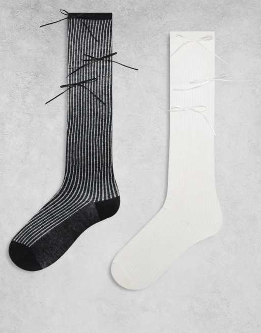 Kaiia Exclusive – Zestaw 2 par prążkowanych skarpetek do kolan z satynowymi kokardkami w kolorach czarnym i białym