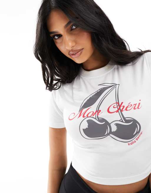 Kaiia – Krótki biały T-shirt z grafiką z wiśniami