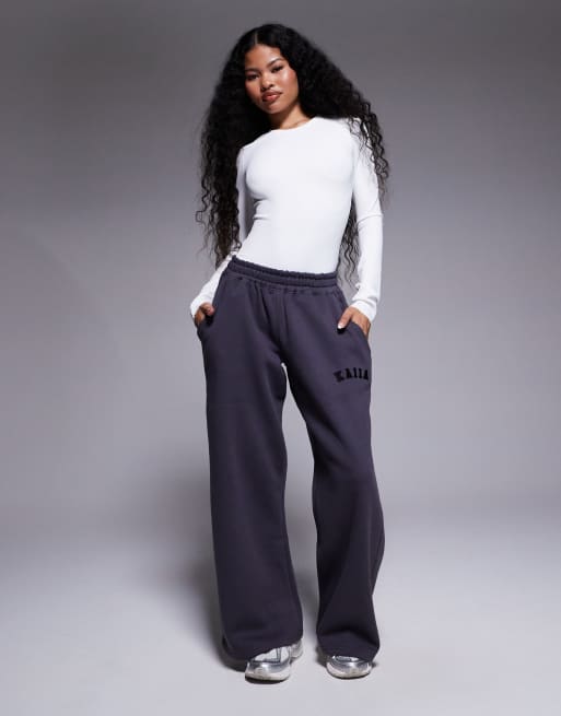 Kaiia Petite – Ciemnoszare joggersy z szerokimi nogawkami z mieszanki bawełny z haftowanym logo