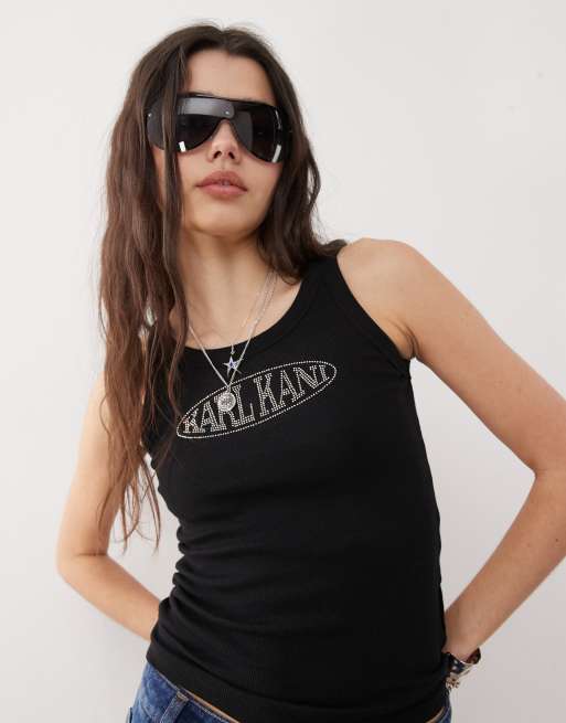 Karl Kani – Signature – Czarny prążkowany top bez rękawów z logo ze strasami
