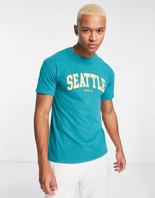 Kavu – Zielony T-shirt z nadrukiem „Seattle” w uczelnianym stylu na piersi