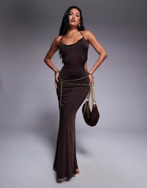 Tiger Mist – Suriya – Brązowa sukienka maxi z drapowanym dekoltem typu halter, odkrytymi plecami i ozdobnym łańcuszkiem