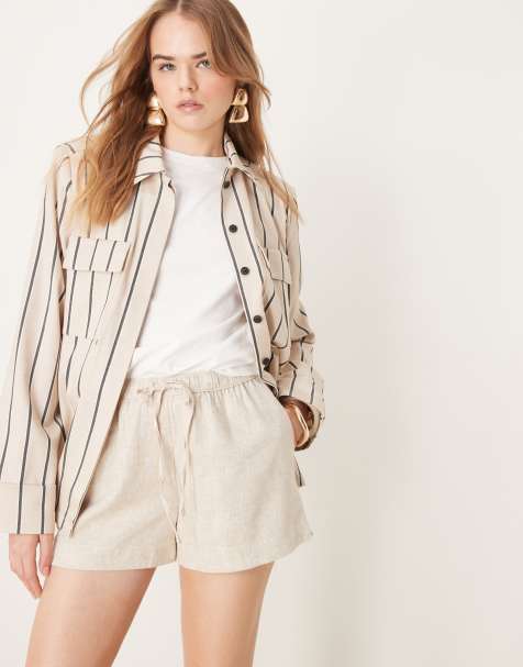Vero Moda – Mieszaj i łącz – Jasnobeżowe eleganckie szorty w prążki z domieszką lnu, część zestawu