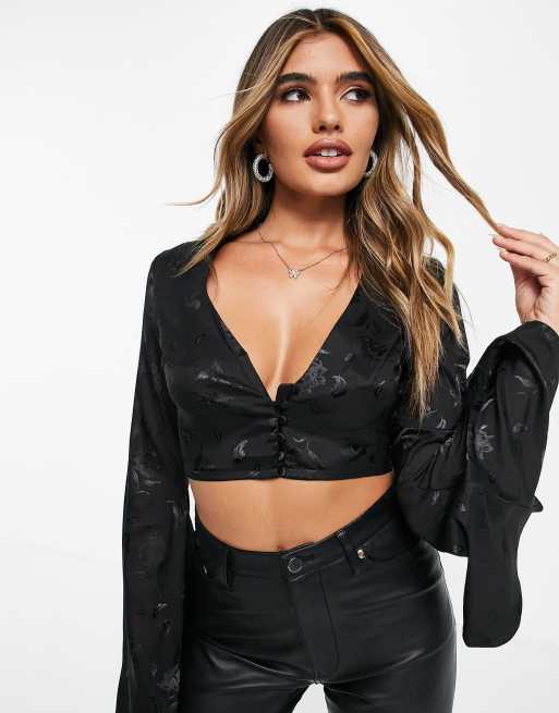 Koco & K – Czarny krótki satynowy top z głębokim dekoltem i rozkloszowanymi rękawami