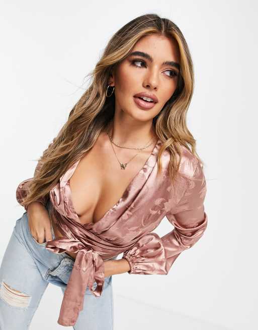 Koco & K – Jasnobrązowy krótki top w kwiaty z obszernymi wiązanymi rękawami i głębokim dekoltem