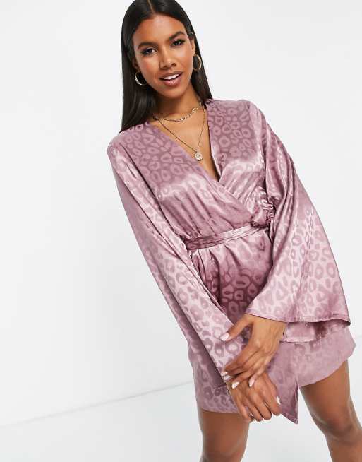 Koco & K – Jasnofioletowa kopertowa sukienka mini z rozszerzanymi rękawami i wypalanym wzorem