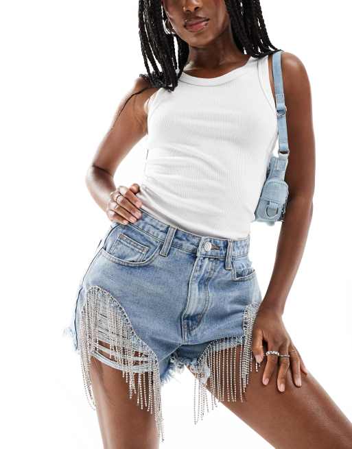 Kyo The Brand – Niebieskie szorty jeansowe ze zdobieniami i postrzępionym dołem