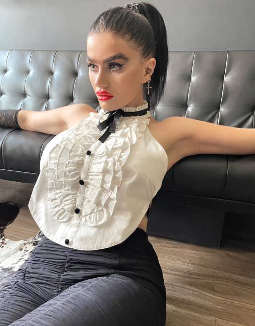 Labelrail x Sophia – Hadjipanteli – Biała koszula z falbanką bez pleców
