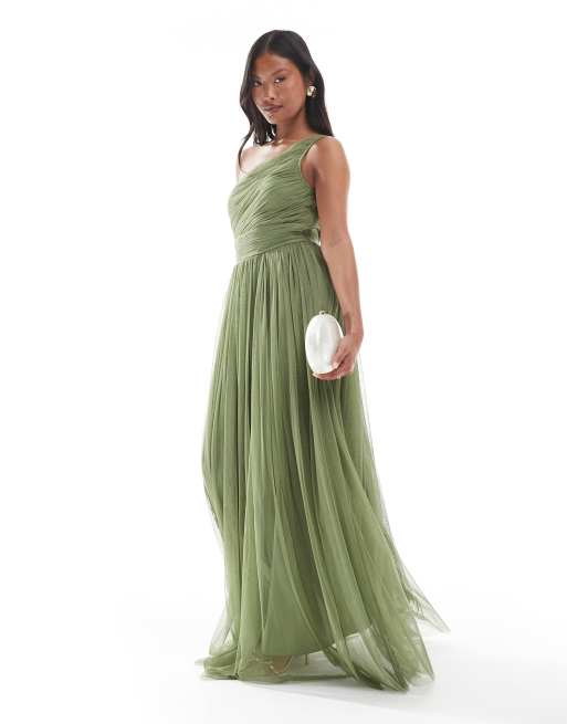 Lace & Beads Petite Bridesmaid – Oliwkowa sukienka maxi na jedno ramię dla druhny
