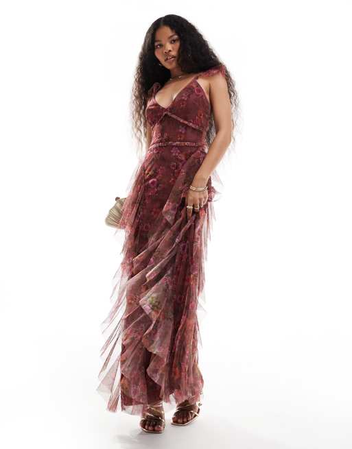 Lace & Beads Petite – Sukienka maxi w fioletowy kwiatowy wzór
