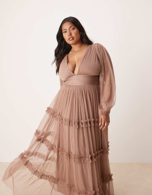 Lace & Beads Plus – Sukienka maxi z falbankami w stylu boho w jasnym odcieniu taupe