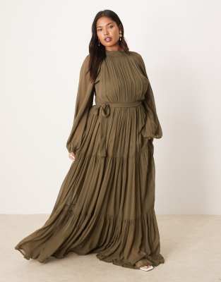 Lace & Beads Plus – Warstwowa sukienka maxi z balonowymi rękawami, w kolorze głęboko oliwkowym