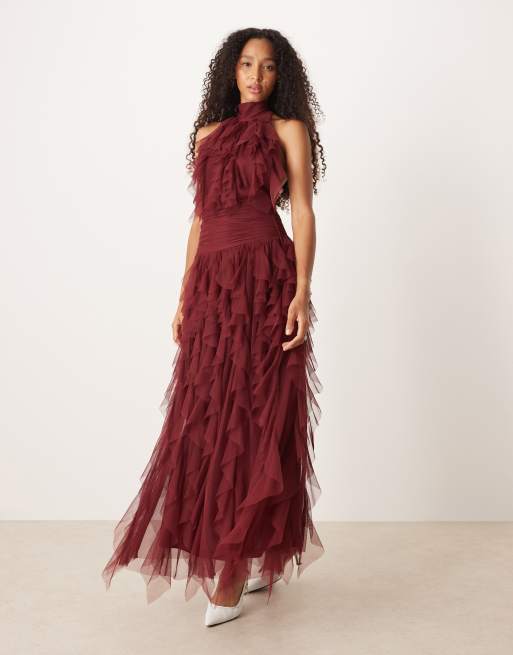 Lace & Beads – Bordowa sukienka maxi z falbankami i odkrytymi plecami