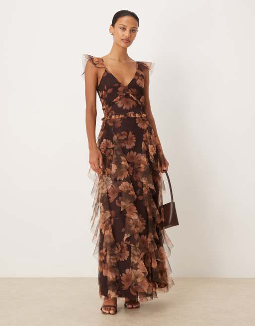 Lace & Beads – Brązowa wzorzysta sukienka tiulowa maxi z falbankami