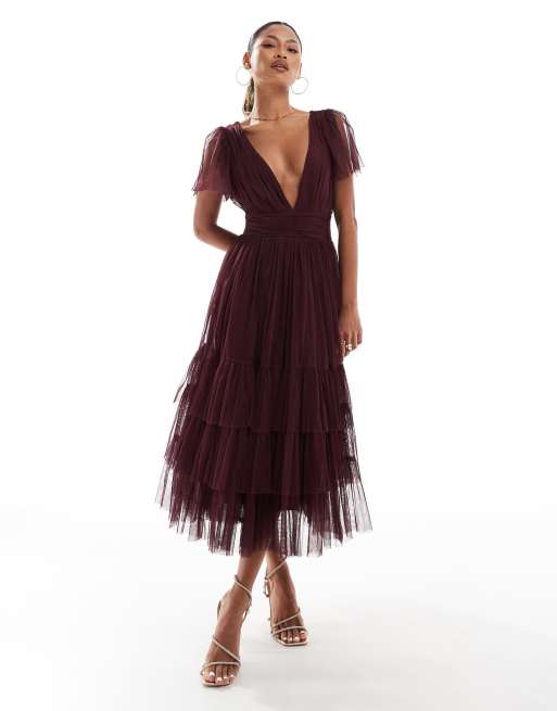 Lace & Beads Bridesmaid – Madison – Bordowa tiulowa sukienka midi z dekoltem w szpic