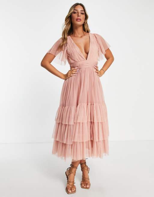 Lace & Beads Bridesmaid – Madison – Pudroworóżowa tiulowa sukienka z dekoltem w szpic