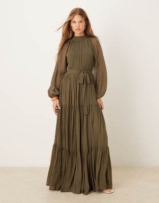 Lace & Beads – Ciemnooliwkowa warstwowa sukienka maxi z balonowymi rękawami