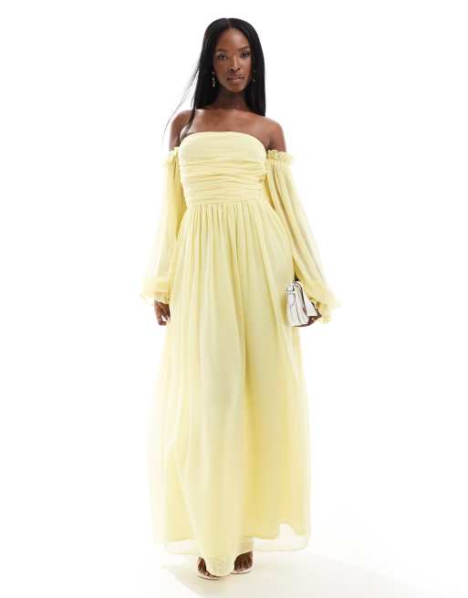 Lace & Beads – Cytrynowożółta marszczona sukienka maxi z balonowymi rękawami