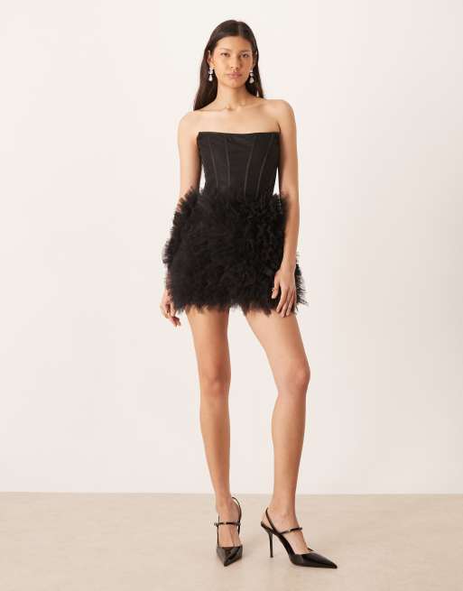 Lace & Beads – Czarna sukienka mini z gorsetem z dekoltem bandeau i tiulową spódnicą
