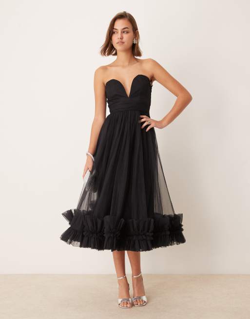 Lace & Beads – Czarna tiulowa sukienka gorsetowa midaxi z falbanką u dołu