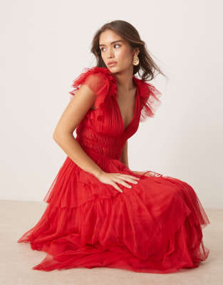 Lace & Beads – Czerwona warstwowa sukienka maxi z falbanką na ramionach